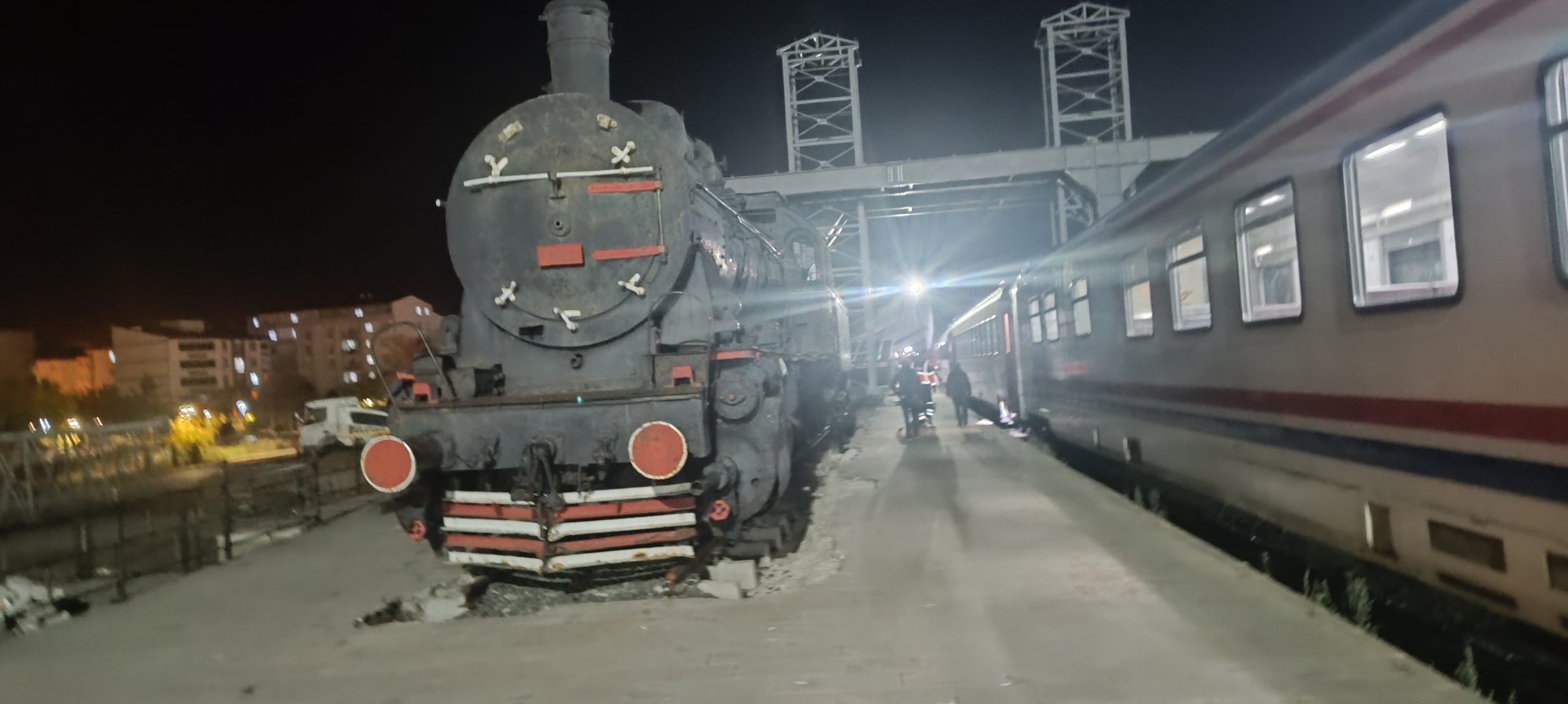 В Карс мы прибыли точно по расписанию, в 20:20, когда ночь уже полностью вступила в свои права. На перроне, под тусклым светом фонарей, стоял, застыв в вечном ожидании, паровоз-памятник — чёрный, отлитый из самой ночи, немой страж ушедшей эпохи и символ всех путешественников, чей путь заканчивается здесь, у восточных рубежей. Я сделал прощальный снимок, и паровоз замер на нём как вечная точка в конце долгого предложения, написанного рельсами.